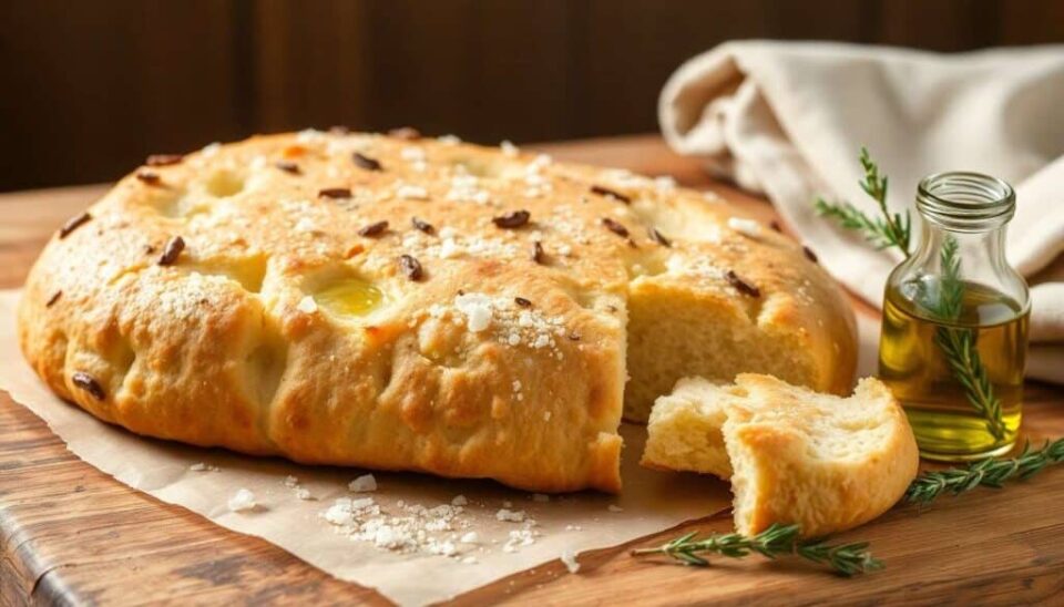 Base : farine, eau, levure, sel, huile d’olive. Garniture : romarin frais, tomates séchées, fleur de sel. Astuce : Badigeonnez généreusement d’huile d’olive avant et après cuisson pour une texture fondante et dorée.