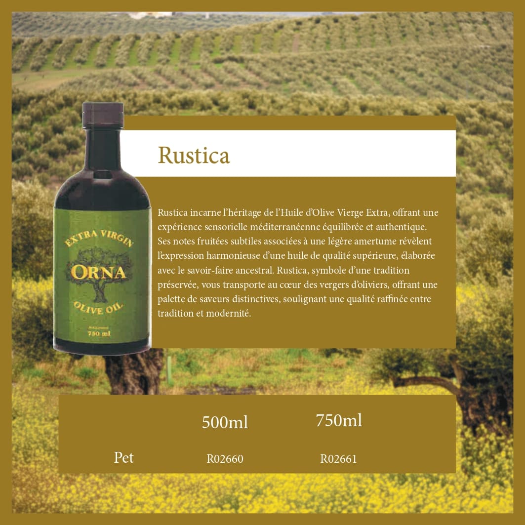Rustica incarne l’héritage de l’Huile d’Olive Vierge Extra, offrant une expérience sensorielle méditerranéenne équilibrée et authentique. Ses notes fruitées subtiles associées à une légère amertume révèlent l’expression harmonieuse d’une huile de qualité supérieure, élaborée avec le savoir-faire ancestral. Rustica, symbole d’une tradition préservée, vous transporte au cœur des vergers d’oliviers, offrant une palette de saveurs distinctives, soulignant une qualité raffinée entre tradition et modernité.